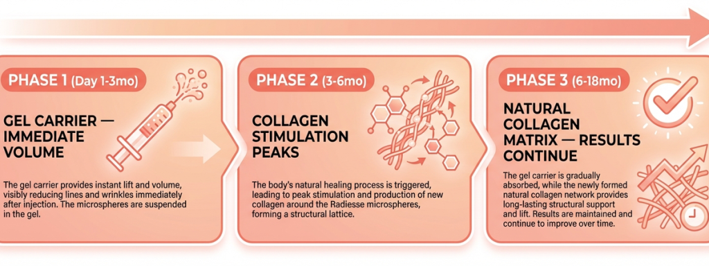Months 6–18: The CaHA microspheres fully biodegrade. What remains is your own collagen matrix — the long-lasting structural support that keeps results looking natural even as the product itself is gone. This is why Radiesse lasts longer than fillers that rely on gel alone — your body’s collagen provides support that continues well beyond the initial treatment areas.